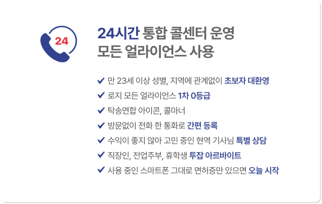 3. 든든한 안전망 (24시간 상황실 & 보험) 운행 중 돌발 상황이 발생하면 즉시 1533-1533 상황실로 연락 주세요. 전문 상담원이 기사님의 방패가 되어 드립니다. 또한, 완벽한 단체 보험 가입으로 만일의 사고에도 기사님의 자산과 안녕을 철저히 보호합니다.