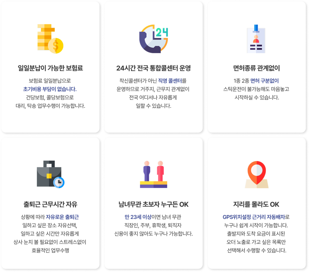 4. 100% 보험 가입 및 당일 정산 기사님의 안전이 최우선입니다. 회사 보험 또는 개인 보험 선택이 가능하며, 수익금은 매일 혹은 매주 단위로 즉시 현금 출금이 가능해 가계 운영에 큰 도움이 됩니다.